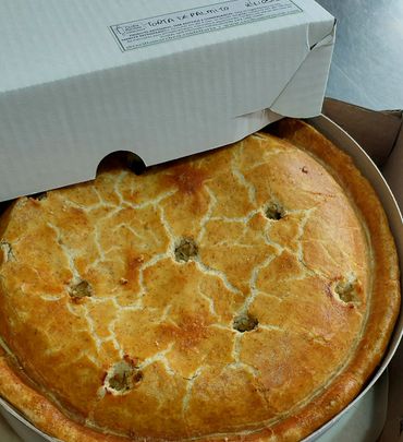 Farinha de trigo, manteiga, pernil em lascas, creme de batata (batata e leite), cebola, salsinha, pimentão vermelho, cebolinha, azeitonas verdes, mix de ervas finas secas, ), sal, ovo. Contém glúten, ovos, leite e derivados.